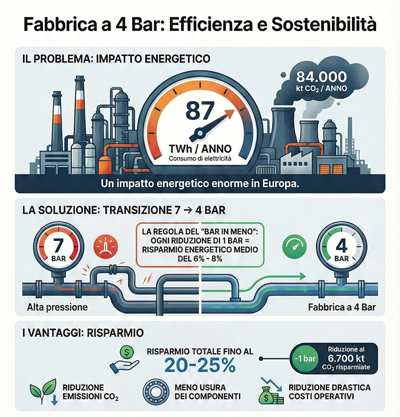 Ridurre la pressione dell’aria compressa a 4 bar non è solo una scelta ecologica, ma una mossa finanziaria intelligente per recuperare competitività.